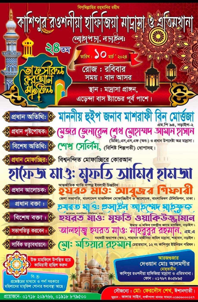 আগামি ১০-০৩-২০২৪ রোজ রবিবার ঐতিহ্যবাহী কাশিপুর ইউনিয়নে  রওশনীয়া হাফেজিয়া মাদ্রাসা ও এতিমখানায় নড়াইল জেলার অন্যতম সেরা মাহফিল অনুষ্ঠিত হতে যাচ্ছে।উক্ত মাহফিলে প্রধান অতিথি হিসাবে উপস্থিত থাকবেন নড়াইলের কৃতি সন্তান মুজিব আদর্শের সৈনিক  বাংলাদেশ আওয়ামী লীগের যুব ক্রীড়া বিষয়ক সম্পাদক নড়াইল ২ আসনের  সম্মানিত এমপি জাতীয় সংসদের হুইপ মাশরাফি বিন মুর্তজা। বিশেষ অতিথি হিসাবে উপস্থিত থাকবেন সাবেক স্পেশাল সিকিউরিটি ফোর্সের মহাপরিচালক মেজর জেনারেল শেখ মোহাম্মদ আমান হাসান। উক্ত মাহফিলটি পরিচালনা করবেন শেখ মোহাম্মদ মতিয়ার রহমান ১২ নং কাশিপুর ইউনিয়ন পরিষদের বার বার  নির্বাচিত চেয়ারম্যান, উক্ত মাহফিলে প্রধান বক্তা হিসেবে মূল্যবান ওয়াজ করবেন তাফসীরুল কুরআন এর জনপ্রিয় ব্যক্তিত্ব মুফতী  আমির হামজা সাহেব  সহ আরো আলেম-ওলামা গন। নারাই তাকবির আল্লাহু আকবার।