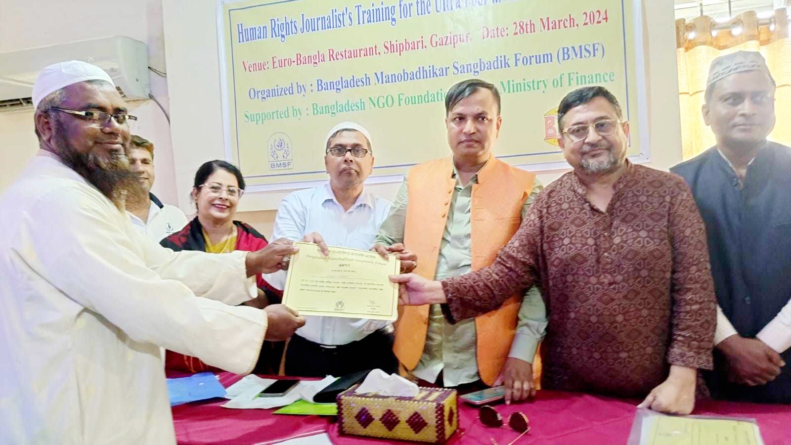 গাজীপুরের বাংলাদেশ মানবাধিকার সাংবাদিক ফোরামের (বিএমএসএফ) উদ্যোগে ও বাংলাদেশ এনজিও ফাউন্ডেশনের সহায়তায় মানবাধিকার সাংবাদিকতা বিষয়ক প্রশিক্ষণ কর্মশালা অনুষ্ঠিত হয়। বৃহস্পতিবার সকাল ১১ টা থেকে বিকেল ৪টা পর্যন্ত গাজীপুর মহানগরের শিববাড়ি এলাকার ইউরো-বাংলা রেস্টুরেন্টে এ প্রশিক্ষণ কর্মশালা অনুষ্ঠিত হয়।গাজীপুর সাংবাদিক ইউনিয়নের সাধারণ সম্পাদক এম এ সালাম শান্ত’র সঞ্চালনায় ও ইউনিয়নের সভাপতি আতাউর রহমানের সভাপতিত্বে অনুষ্ঠানে প্রধান অতিথি হিসেবে বক্তব্য রাখেন-গাজীপুরের অতিরিক্ত পুলিশ সুপার রবিউল ইসলাম বিশেষ অতিথি হিসেবে উপস্থিত ছিলেন- বাংলাদেশ ফেডারেল সাংবাদিক ইউনিয়নের কোষাধ্যক্ষ খায়রুজ্জামান কামাল, জাতীয় প্রেসক্লাবের ব্যবস্থাপনা কমিটির সদস্য শাহনাজ বেগম পলি। উপস্থিত ছিলেন-গাজীপুর সাংবাদিক ইউনিয়নের সহ-সভাপতি মোহাম্মদ আলমগীর হোসেন,সাংগঠনিক সম্পাদক মোহাম্মদ আলী ভূঁইয়া, কালীগঞ্জ ইউনিট চিফ আব্দুল গাফফারসহ
