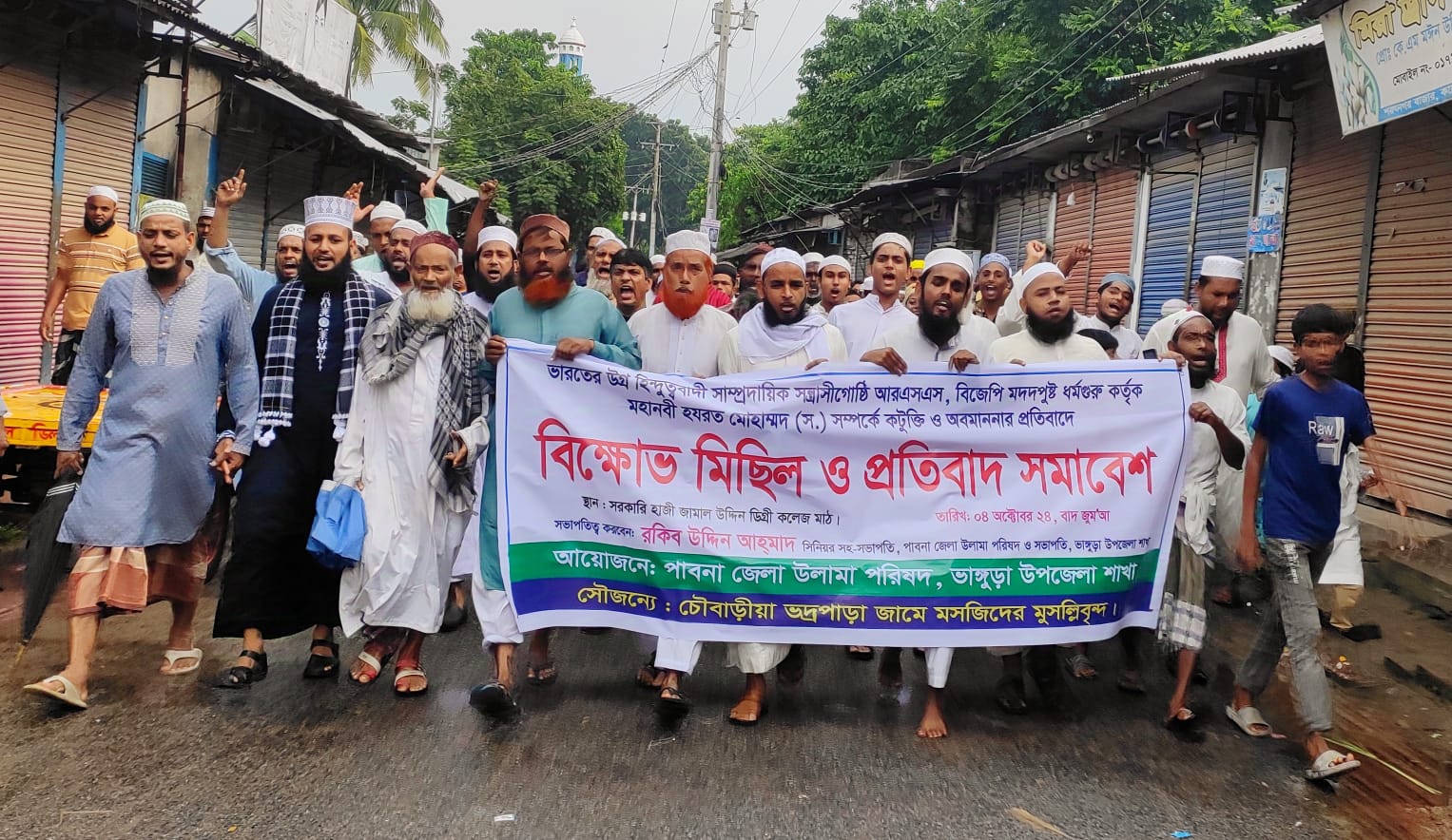 শুক্রবার (৪ অক্টোবর) জুমার নামাজের পর পাবনা জেলা উলামা পরিষদ ভাঙ্গুড়া উপজেলা শাখার আয়োজনে সরকারি হাজী জামাল উদ্দিন ডিগ্রী কলেজ জামে মসজিদ থেকে এই বিক্ষোভ মিছিল বের করা হয়।
